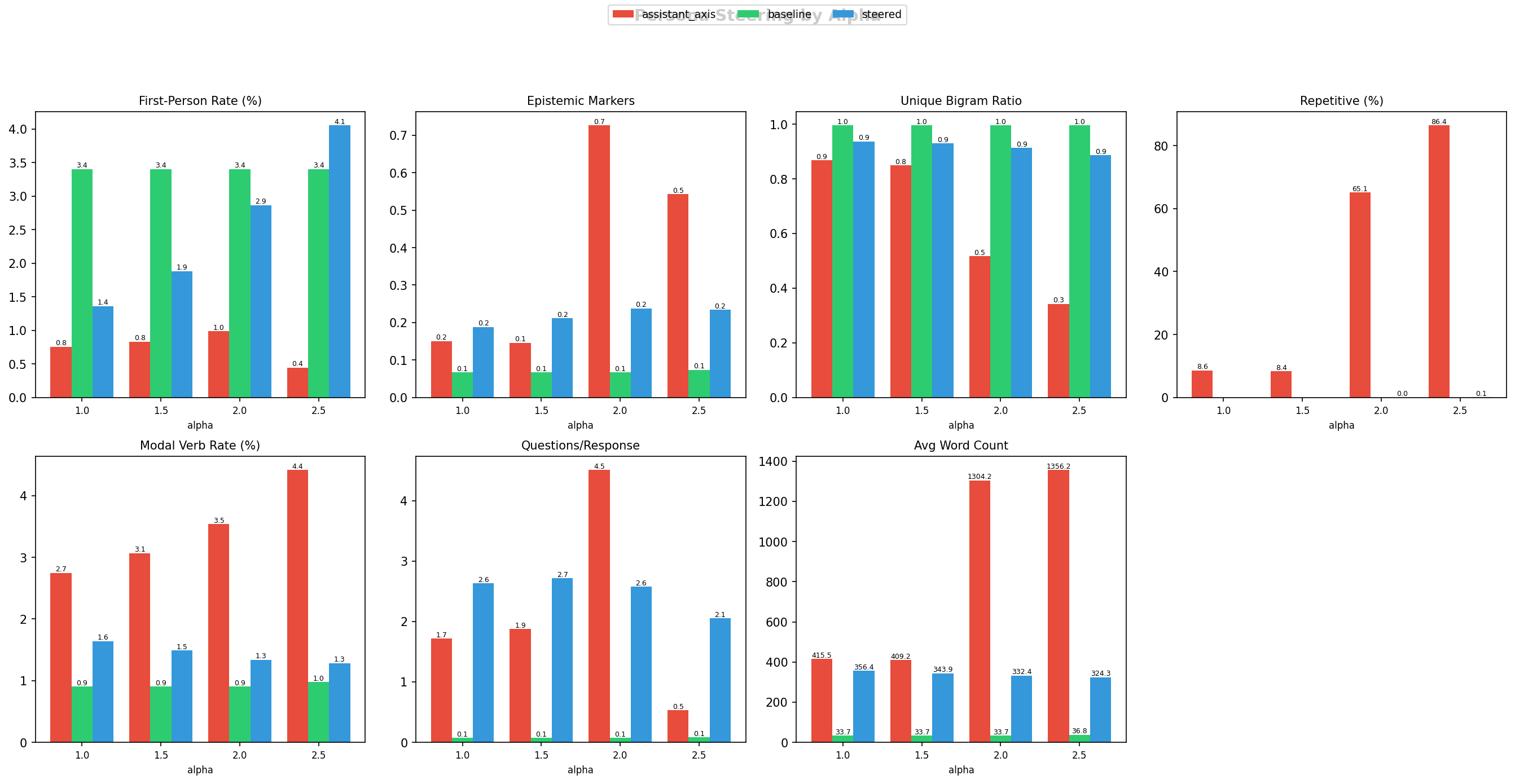 The figure below compares eight metrics across three methods: the assistant axis (red), the prompt-engineered gold baseline (green), and our steered method (blue). Each group of bars shows how the metric changes as we increase steering strength (alpha from 1.0 to 2.5, i.e. how aggressively we push the model along the role vector).