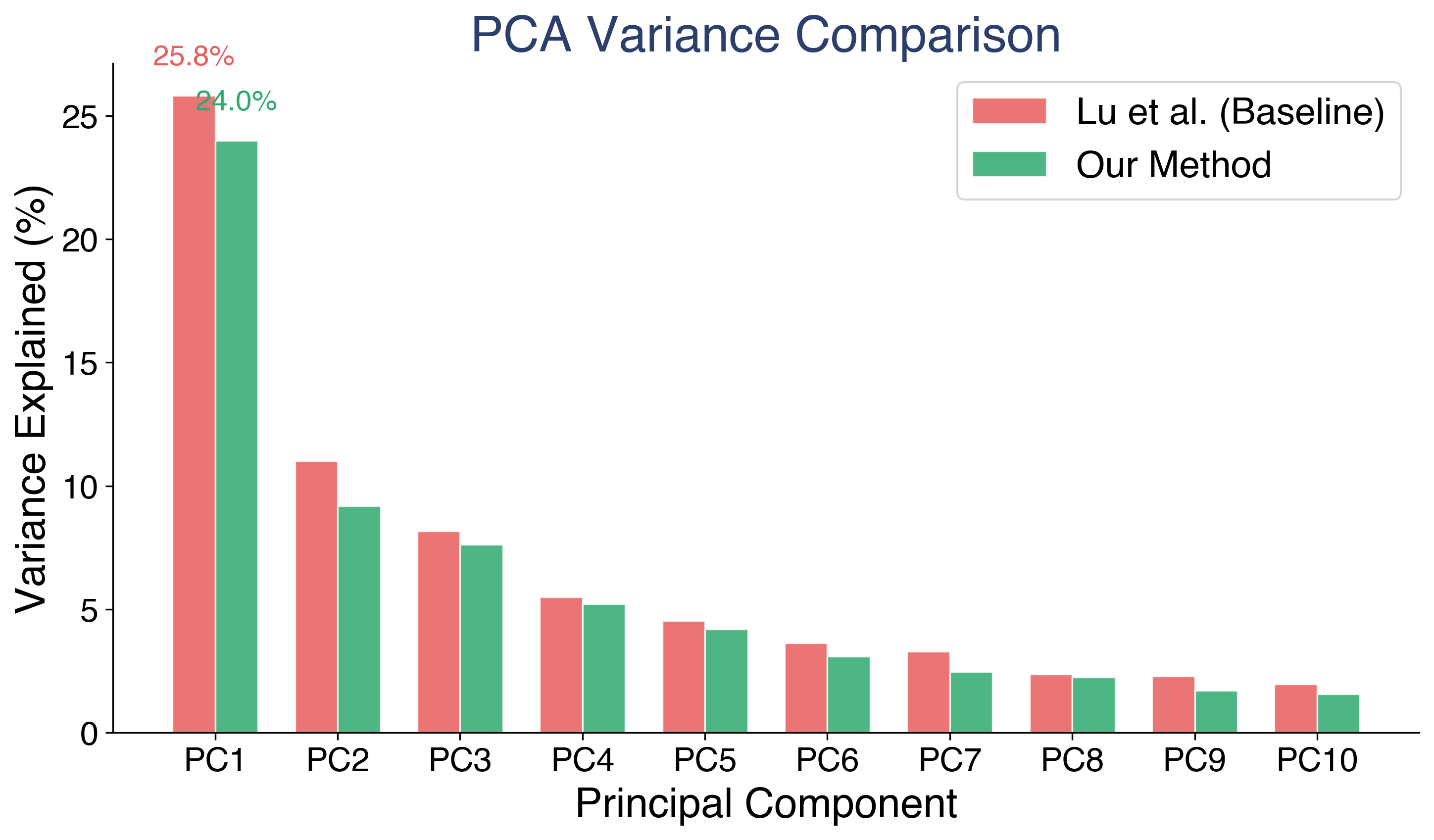 PCA on the role vector matrix confirms this. Approximately 20 principal components capture 90% of variance across 275 roles in 4,096-dimensional space. PC1 (associated with the assistant axis) explains 24.0% of variance in our vectors versus 25.8% in the baseline. That lower PC1 concentration means our method distributes variance more evenly across components. In plain terms: our roles are more differentiated from each other, not all collapsed onto a single dominant direction.
