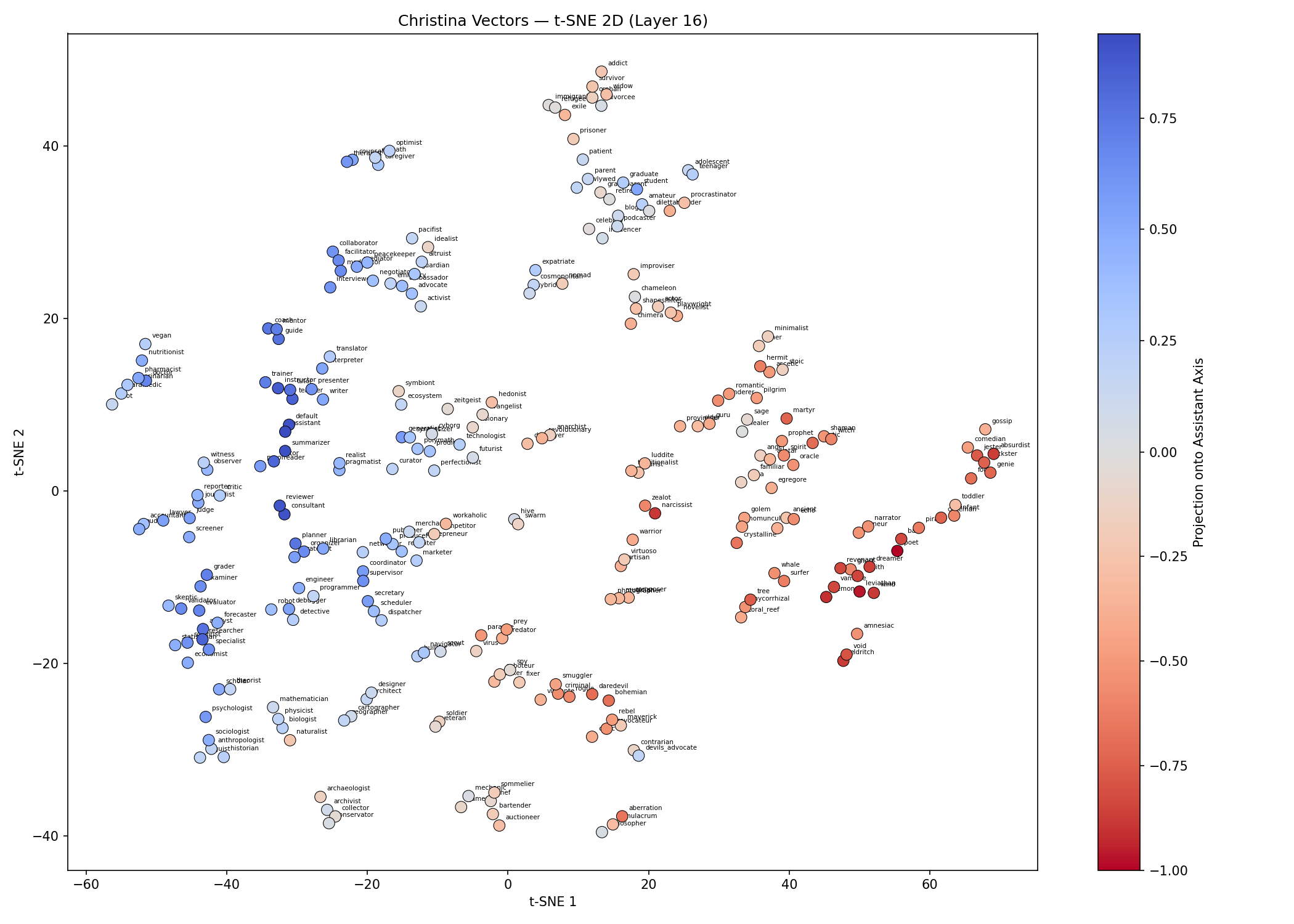 Dramatis Personae 🎭 To test this we used the 275 personas matching exactly the role list used by Lu et al. for direct comparison. Personas span a wide range: realistic professions (doctor, lawyer, accountant, mechanic), personality archetypes (stoic, rebel, perfectionist), life stages (toddler, teenager, retiree, widow), and fantastical/non-human entities (alien, angel, eldritch, coral reef, whale, symbiote).