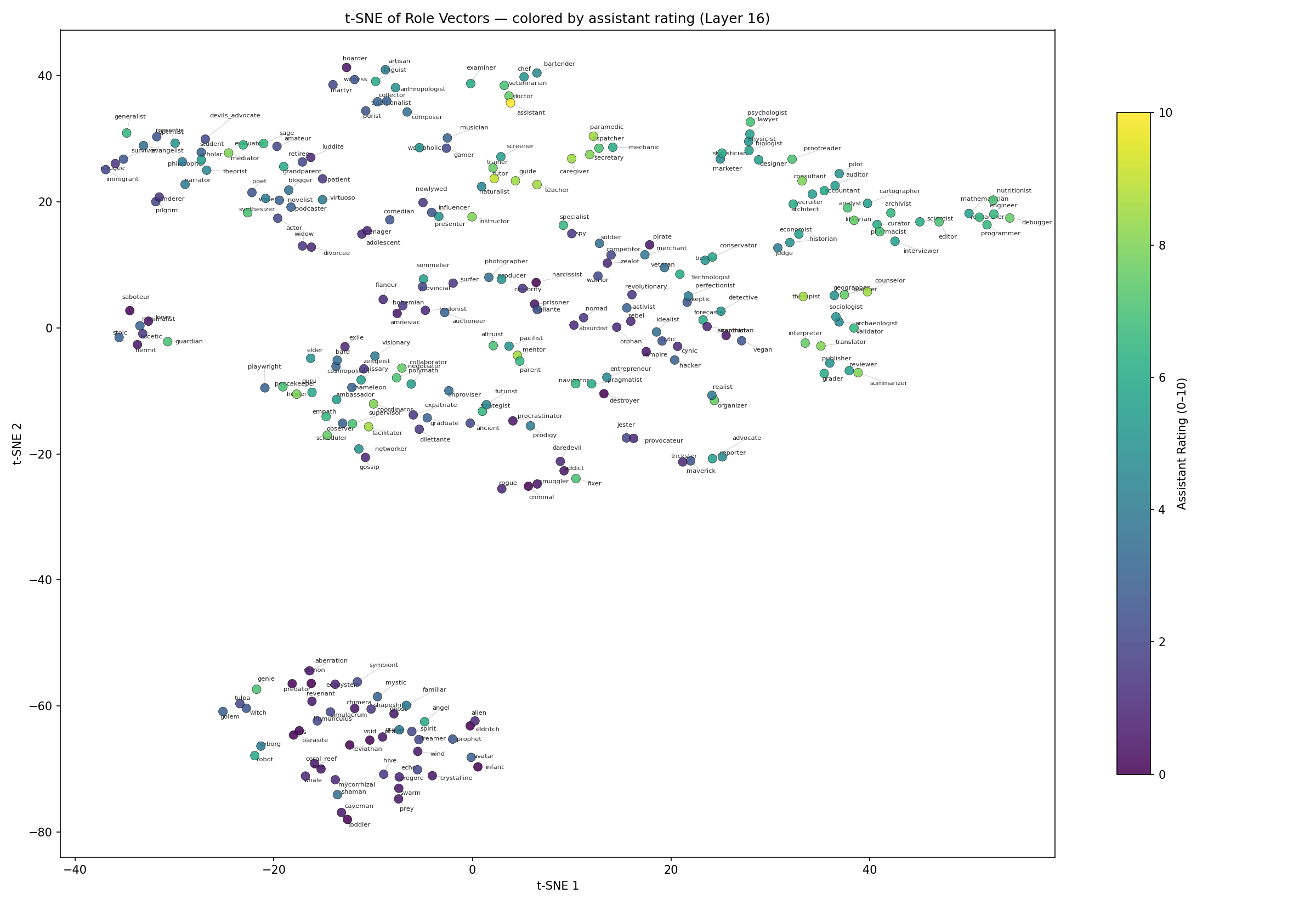 Let’s take a look at some t-SNE plots where we will show some 2D visualizations of “persona space” aka the hyper-dimensional manifold formed by the activation space which we populate with our 4,096-dimensional steering vectors.